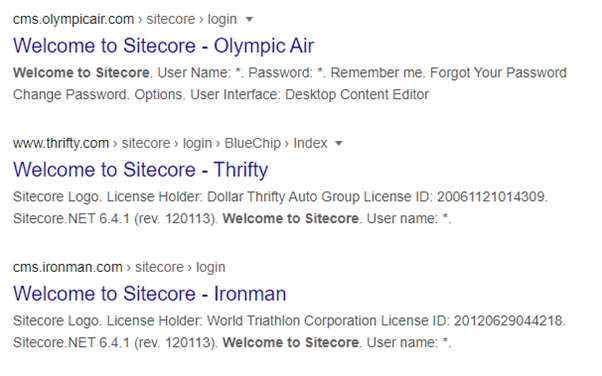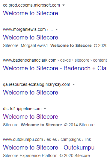 Try this in google:[site:*.com/sitecore/login "Welcome to Sitecore"](https://www.google.com/search?q=site%3A*.com%2Fsitecore%2Flogin+%22Welcome+to+Sitecore%22)