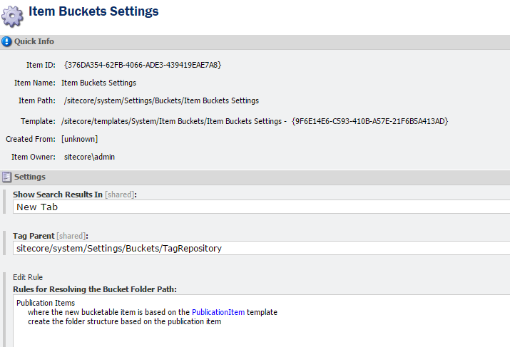 - There is only one Item Buckets Settings item. We would like to see an out of the box solution where we can use multiple settings items with a certain hierarchy (conditions could interfere with each other).