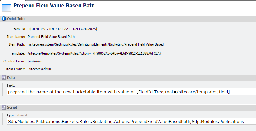 It would be more efficient if we create generic actions to make this Bucket Folder Path possible. Like we mentioned earlier we needed the value of a field of a referenced item and we needed the value of a DateField from the Bucketable item. We can do this with two separate actions that work based on prepending.
