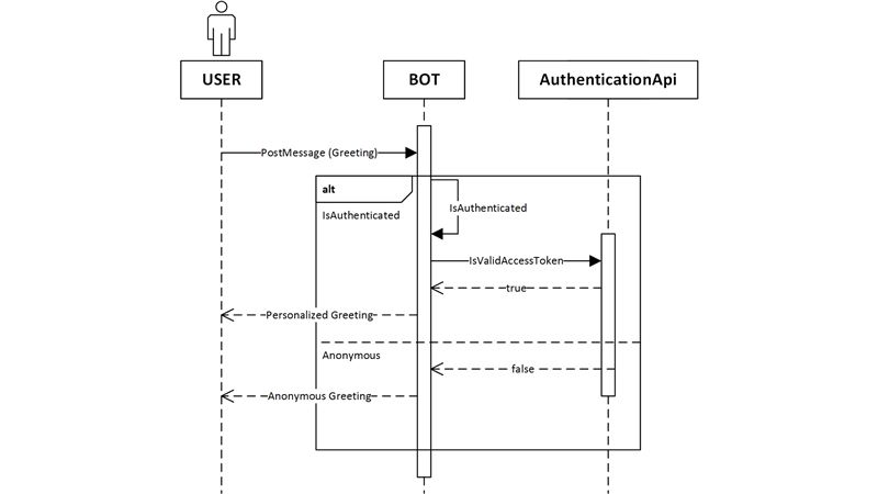 Authentication with the Bot happens when the user asks for something that needs the user to be authenticated with Sitecore. The following diagram shows the flow of the conversation when the user greets the bot in an authenticated situation and an anonymous situation.