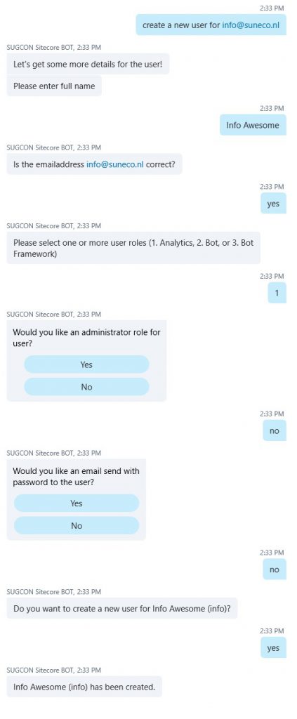 For the Sitecore Bot I used FormFlow to guide the user in creating a new user. There are multiple ways for prefilling the FormFlow. You can ask to just create a new user or you can provide a username or email address right away. If you provide an email address then the Bot will check if a user with the name part of the email address already exists. If it doesn’t exist it will use this for the username of the user to create. During the conversation FormFlow will ask the user if the username that was provided should be used.