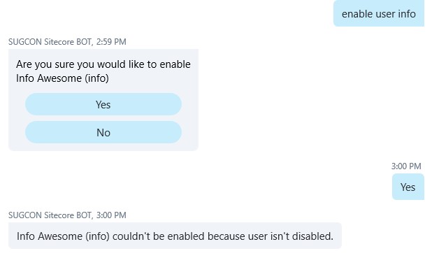 Whether you would like to create, delete, disable or enable users in Sitecore you could also ask the Bot to do that for you in your UserContext.